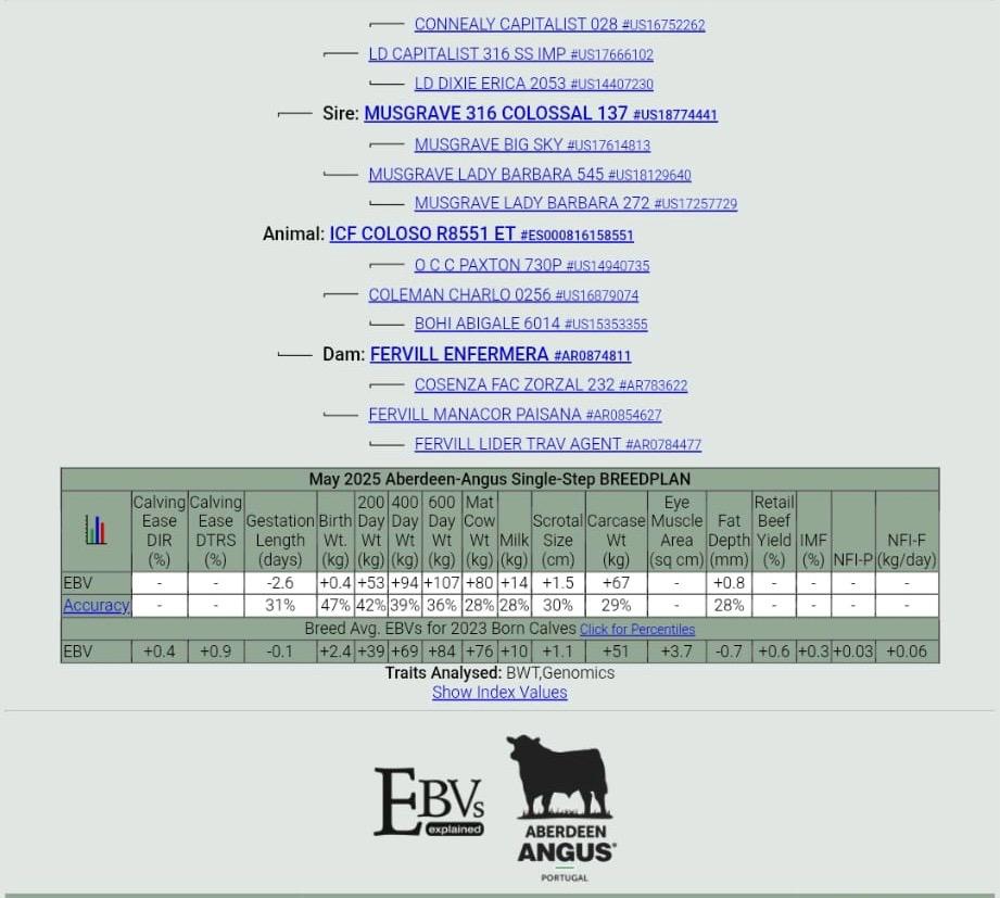 El COLOSO es un padre moderno. Representa exactamente el biotipo que vinimos a criar a Europa. Muy carnicero y a su vez con todos los atributos de la genética pastoril, moderación, bajos requerimientos y precocidad sexual. Con una estructura balanceada y correcta en aplomos.